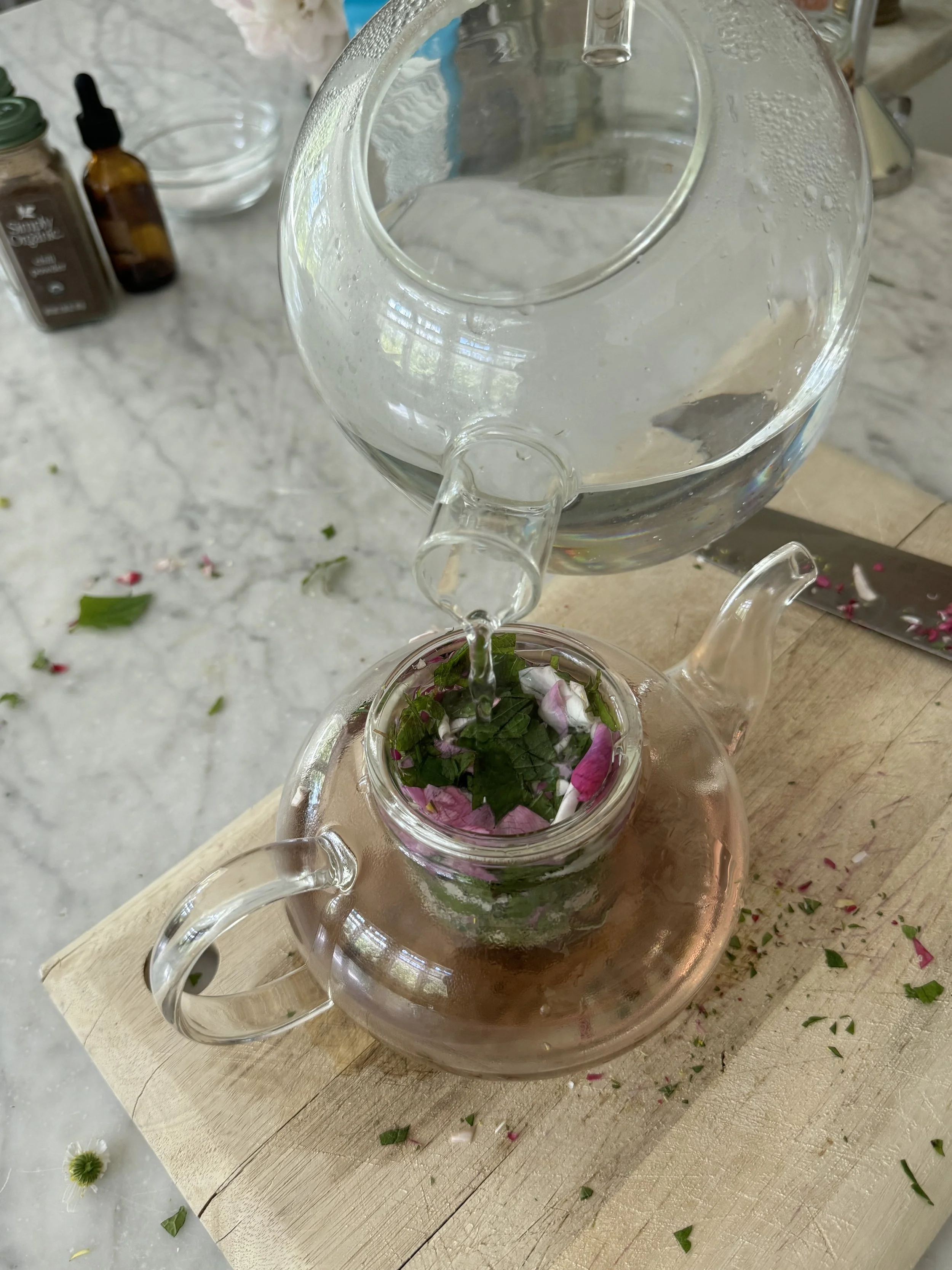 Case and point, my kids WILL NOT eat stinging nettles even though I have repeatedly explained that cooking the plants render the stinging hairs harmless and that nettles are one of the most nutritious plants around. Nope, they say. So one day I threw the leaves into the teapot. The first attempt was straight nettles. My oldest took a sip and said, “Tastes like grass…I be sippin’ the earth!”. He wasn’t psyched to drink all of it. I’ve since learned to blend the nettles with mint or lemon balm and the boys happily guzzle a cup full, with honey of course.