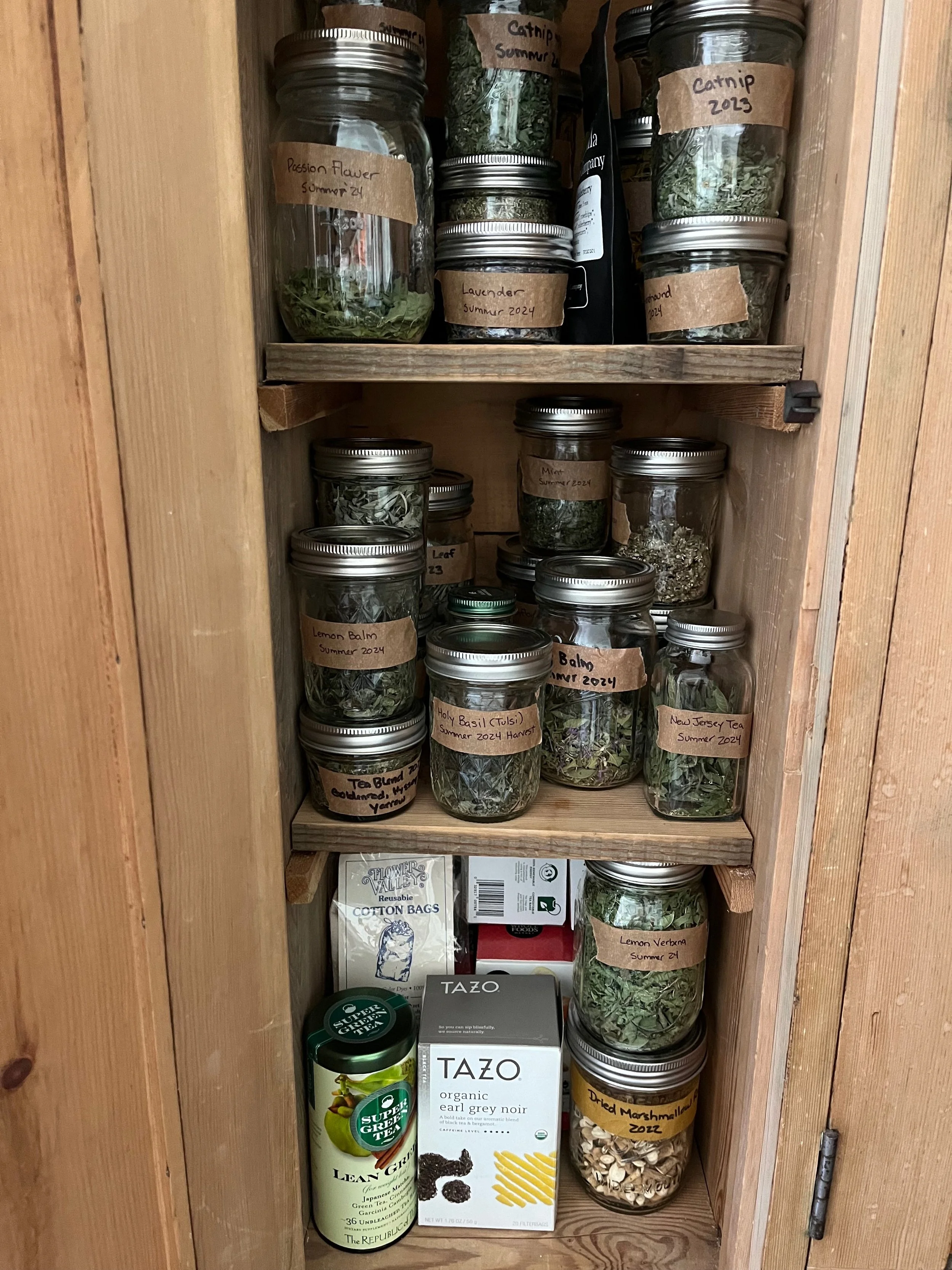 After my waiting room enlightenment, I started making Echinacea tea with the fresh leaves and flowers cut from our garden and eventually learned to also dig a small section of the root in the fall. Then the garden gates flew wide open and all kinds of plants made it into our tea pot. We enjoy tea made from fresh leaves and flowers in the spring and summer. I dry some of the leaves and flowers to add to teas made with roots later in the fall and winter. I still buy boxes of tea for plants I don’t grow, but now my tea cupboard looks like this…